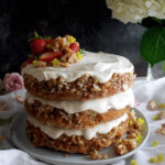 And that is it! The absolute best, most indulgent carrot cake. I top it off with some fresh strawberries and a little bit of the praline that got stuck on the pans as the cakes baked (turned out to be the perfect garnish).