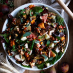 a hearty, satisfying autumn harvest salad with apples, cheddar, charred chicken, candied pumpkin seeds + hazelnuts, and a pomegranate sage vinaigrette