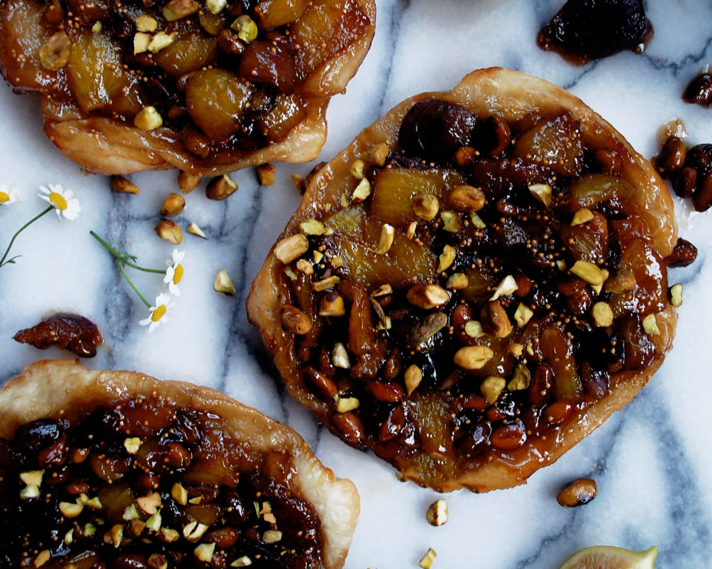 A holiday appetizer that’s as impressive as it is simple to make: apple butter and melted brie tart. The apple butter is spiced with cinnamon and has a subtle sweetness. It’s spooned over puff pastry and then topped with slices of brie, crisp apples, and fresh thyme. The tart gets baked until golden, topped with bacon, and finished with a drizzle of honey.