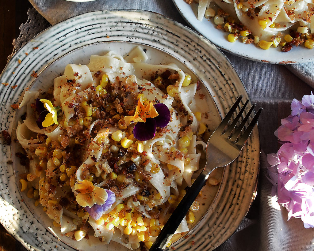 Smoked Corn Tagliatelle with Bacon Breadcrumbs