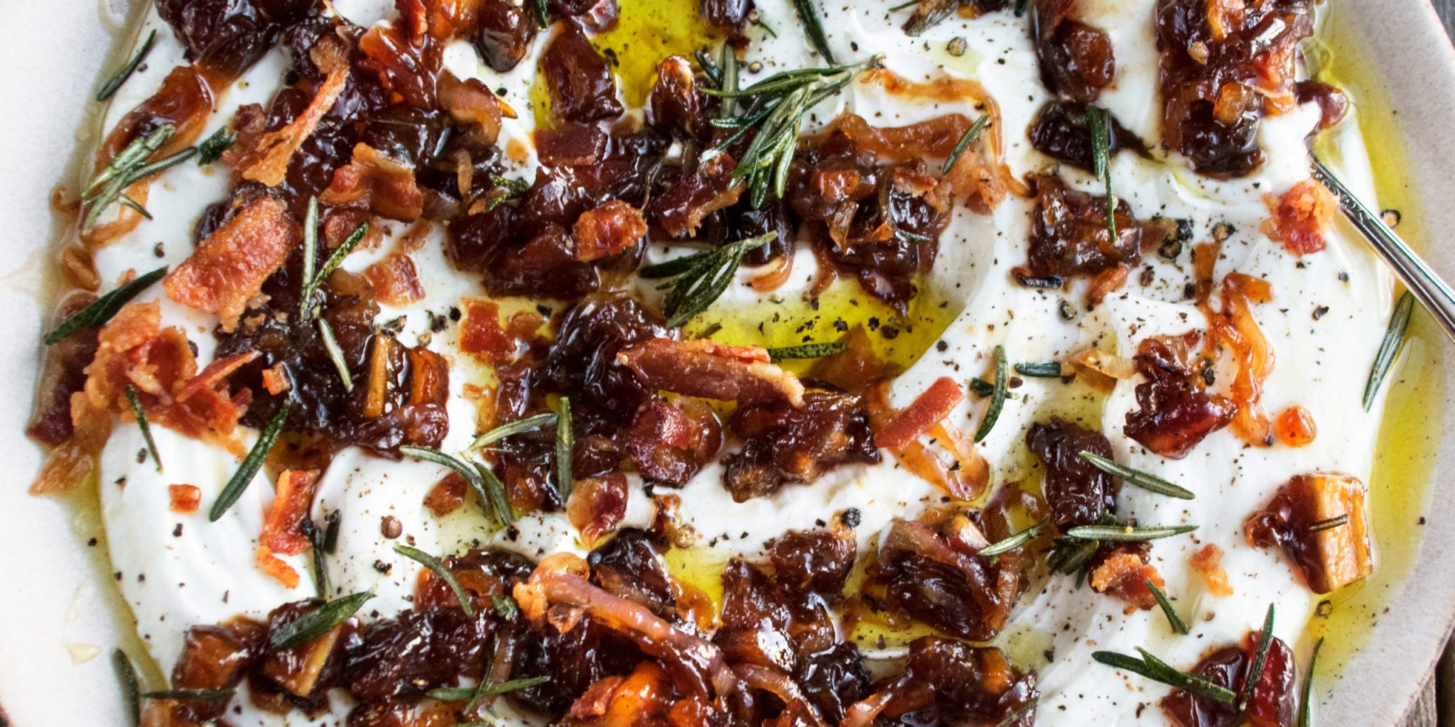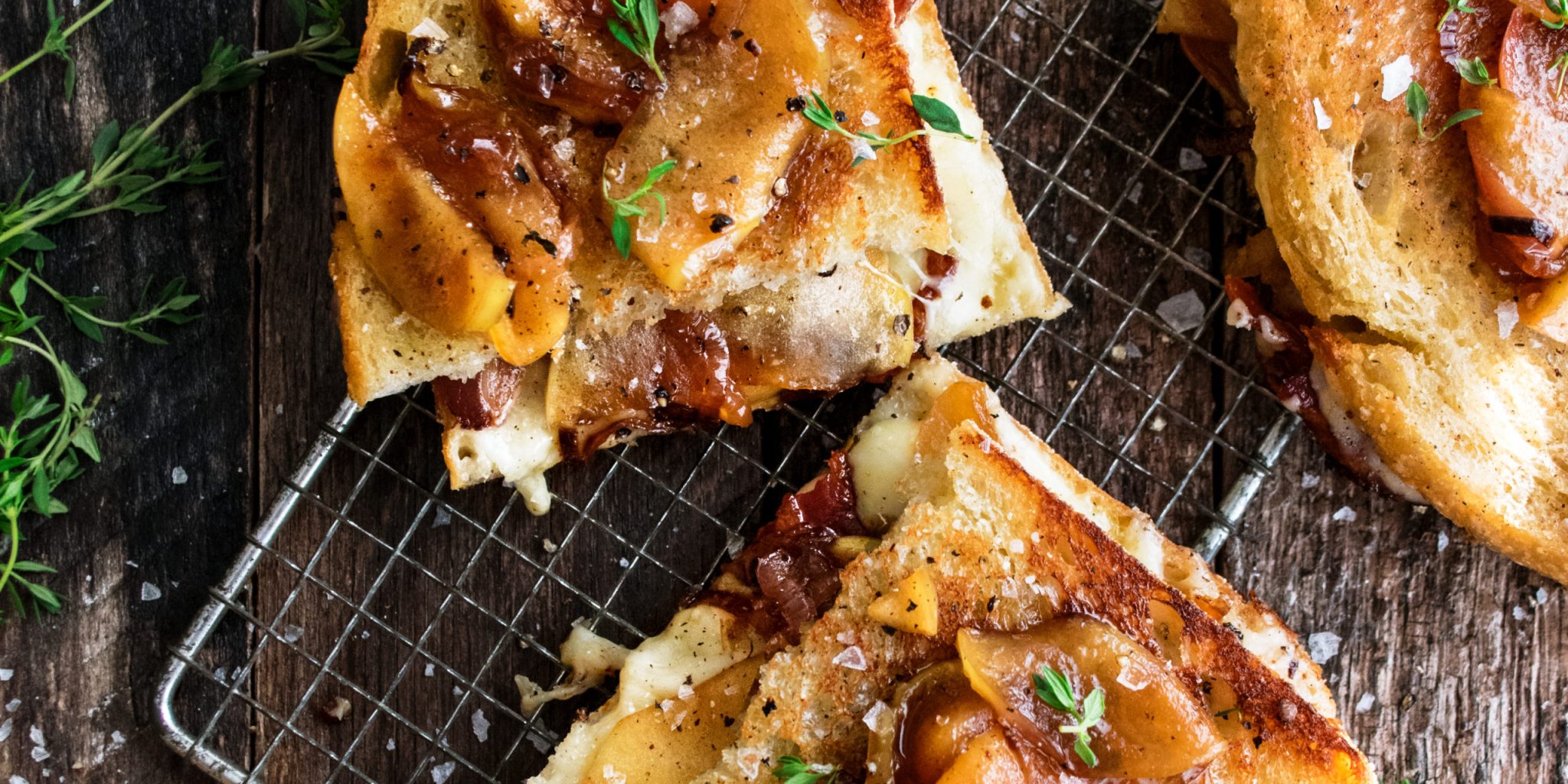 A holiday appetizer that’s as impressive as it is simple to make: apple butter and melted brie tart. The apple butter is spiced with cinnamon and has a subtle sweetness. It’s spooned over puff pastry and then topped with slices of brie, crisp apples, and fresh thyme. The tart gets baked until golden, topped with bacon, and finished with a drizzle of honey.