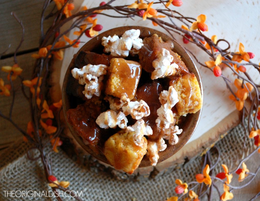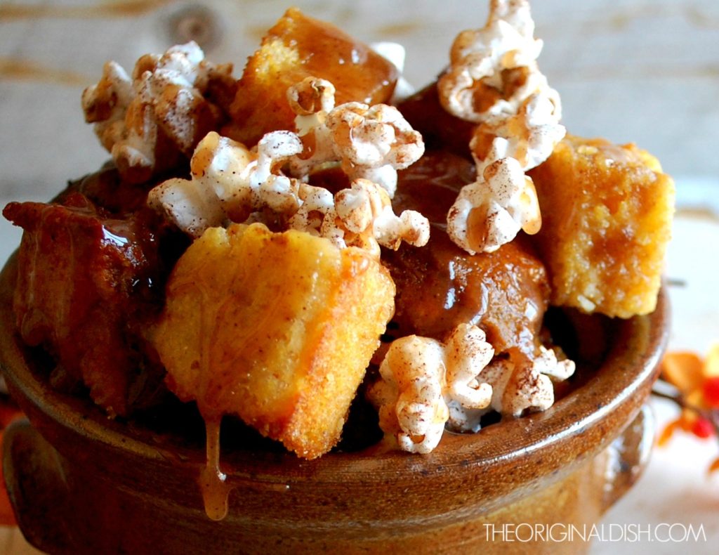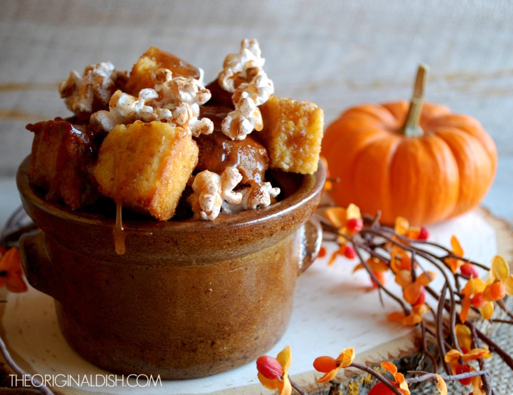 a fun and festive fall dessert: pumpkin cornbread pudding with cinnamon caramel sauce and popcorn