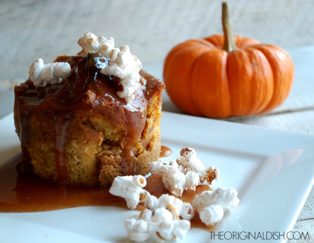- Serve the pumpkin cornbread puddings with a generous amount of cinnamon caramel on top of each.