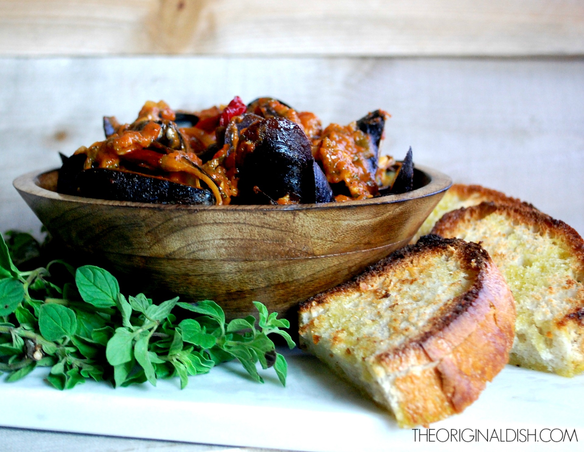 Steamed Mussels in Spicy Tomato-Wine Broth with Crusty Garlic Bread