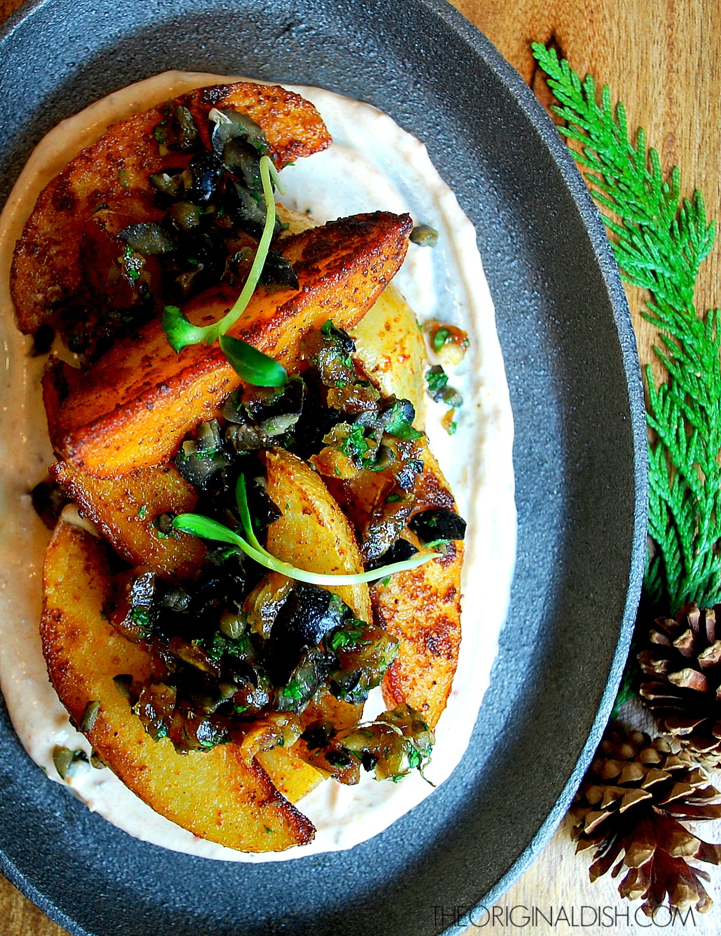 Paprika Seared Potato Wedges with Olive Tapenade & Date Sour Cream