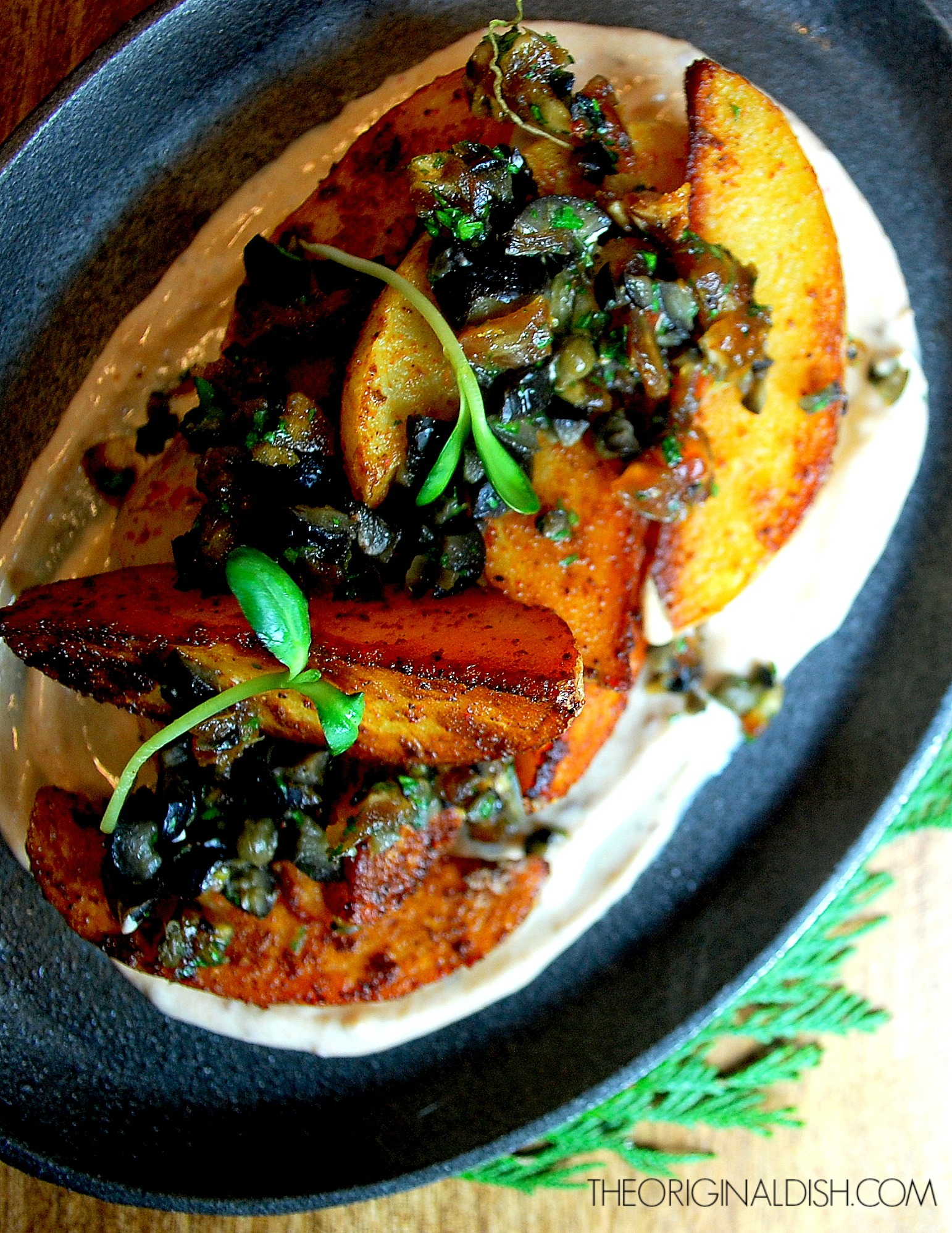 Paprika Seared Potato Wedges with Olive Tapenade & Date Sour Cream