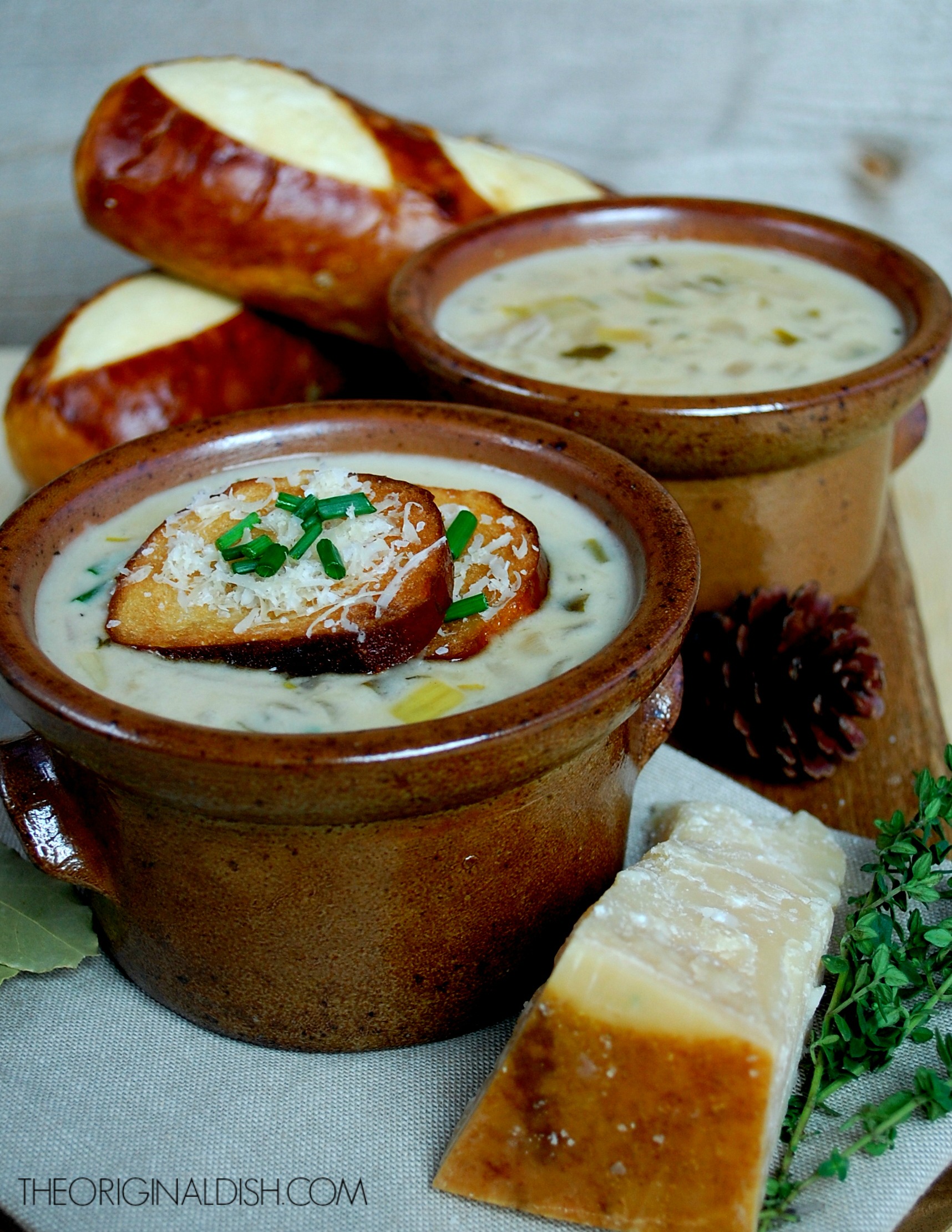 Onion Dijon Soup with Pretzel Roll Croutons