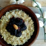 One of my favorite versions I’ve created is simple, “almond-y” oats with a deliciously sweet topping of honeyed blackberries and currants. I start by making a little honey syrup in a saucepan just by heating water and honey. I infuse the syrup with a few cloves for a warming spice. I like to find large, plump blackberries. I leave some whole and cut the others lengthwise so their bright pink-ish color shows. The warm honey syrup gets poured over the berries and dried currants. I let this mixture sit a bit so the berries can soak up all of the sweet flavor and the currants can reconstitute. You’re left with an infused fruit topping and a blackberry-honey syrup to top the oatmeal with.