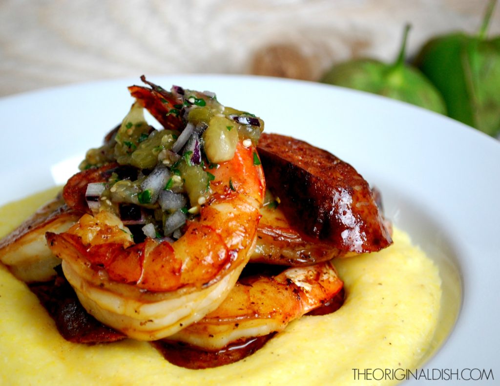 - Serve a large mound of shrimp and chorizo over the Manchego polenta. Top with the salsa verde.