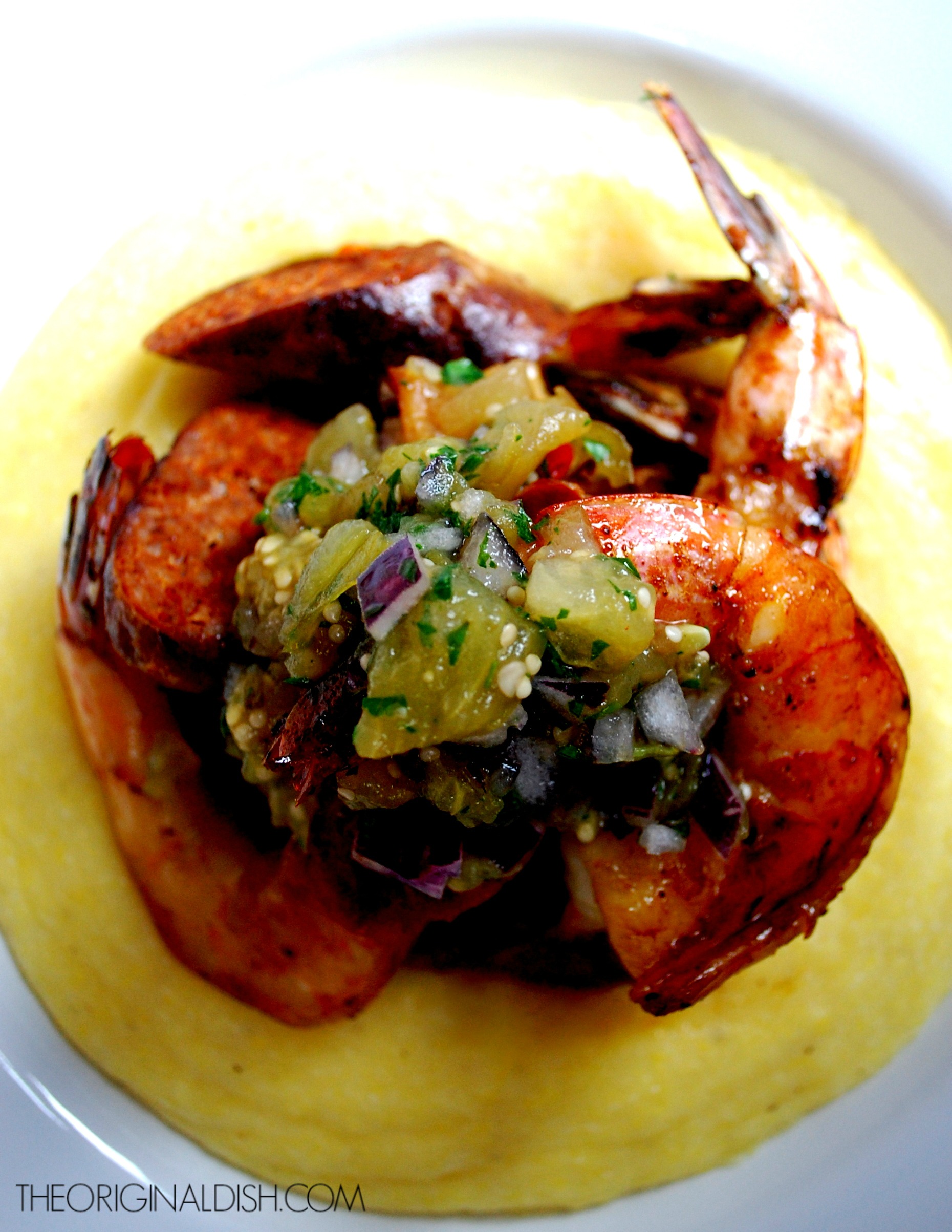 Jumbo Shrimp with Chorizo, Manchego Polenta & Salsa Verde