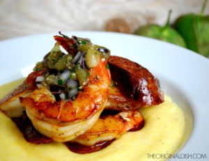 Jumbo Shrimp with Chorizo, Manchego Polenta & Salsa Verde