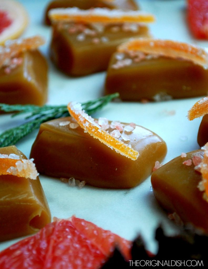 The trick to making caramels is getting the mixture to the right temperature. While I usually judge it by eye, looking for a deep amber color, it’s always useful to pull out the ol’ candy thermometer. You want to let the caramel cook to what is known as “firm-ball stage” in candy making. The temperature range for this stage is between 245°F and 250°F. Cooking it to within this range will create the beautifully soft, chewy texture you expect from caramels once they cool. I add a little cardamom and vanilla to mine, plus I use honey in them instead of corn syrup. I love the flavor of honey and it adds an unexpected deep sweetness. Playing around with flavor combos led me to make a candied grapefruit garnish. Spice from the cardamom, sweet from the honey, tang from the citrus…all you need is a little pink Himalayan salt to bring out all these flavors. Enjoy!