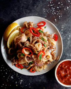 Fried Calamari with Pickled Red Fresno Chili Peppers