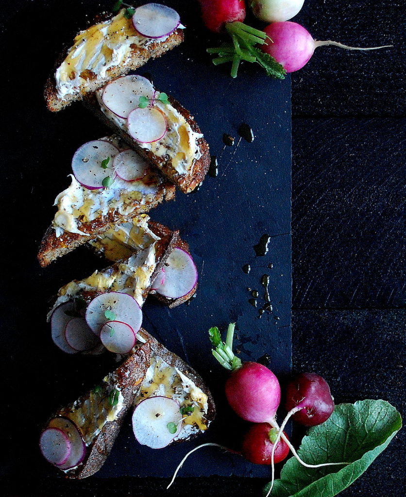 - Use a spoon to spread the mascarpone over each slice of warm bread. Season the cheese with a generous amount of cracked black pepper and sea salt. Drizzle the honey and olive oil over the cheese, and garnish with the shaved radishes. Cut the toasts diagonally or leave whole.