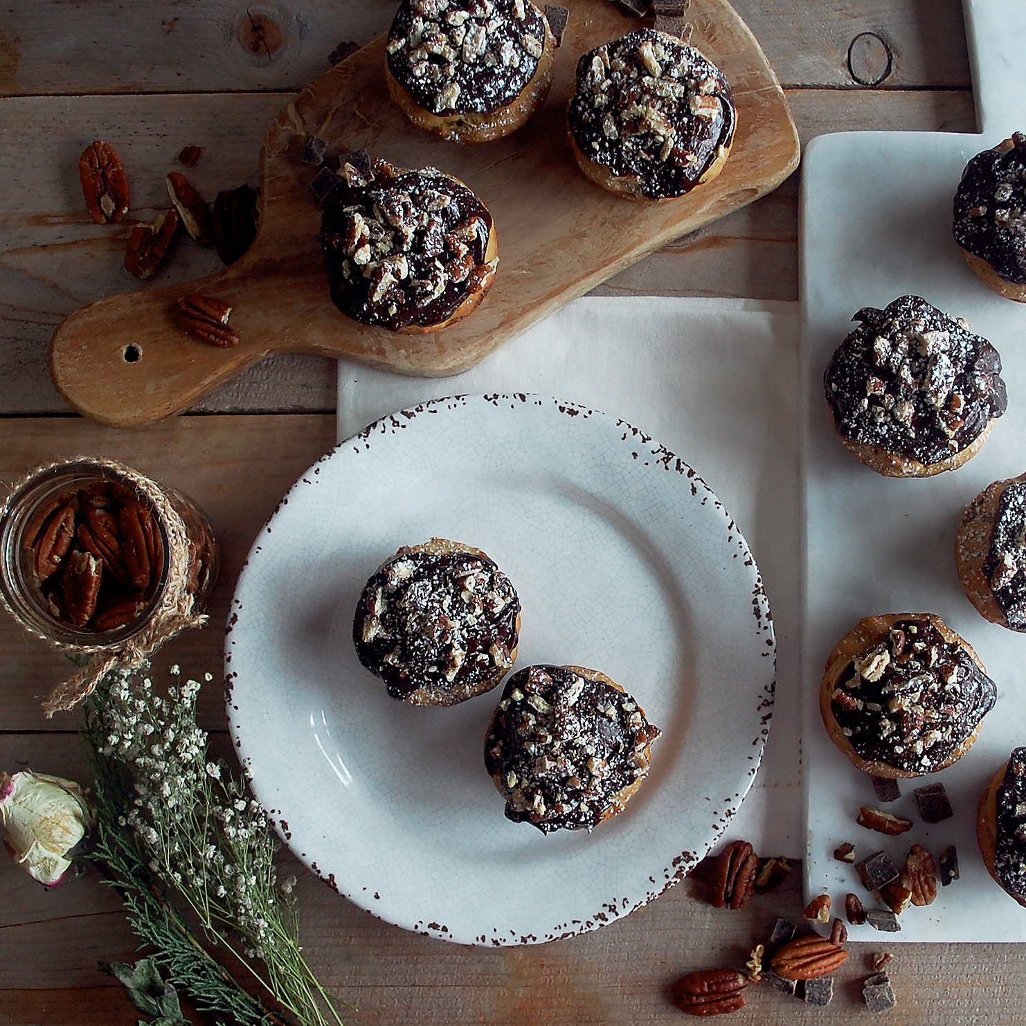 Toasted Pecan Banana Muffins with Dark Chocolate Ganache