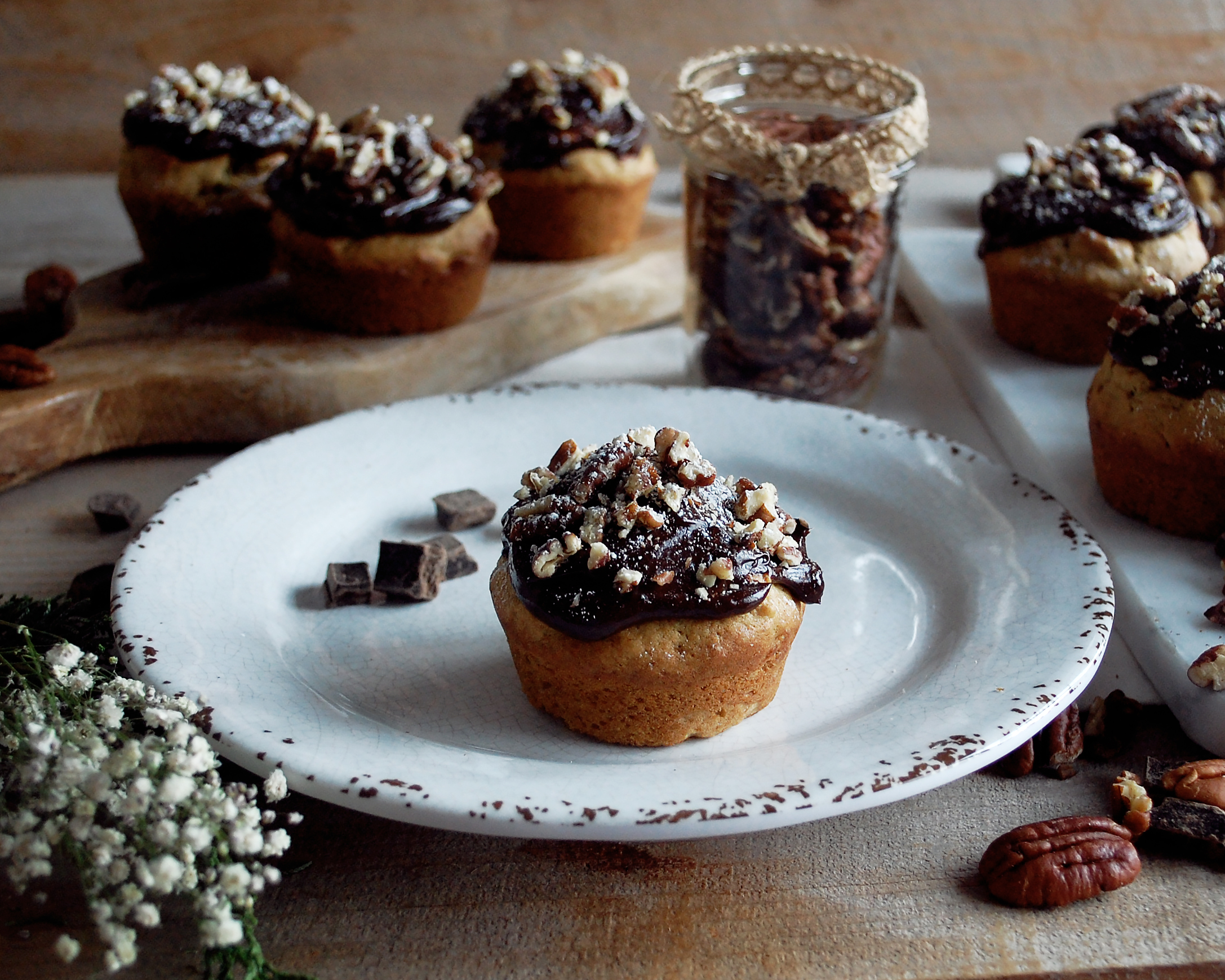 Toasted Pecan Banana Muffins with Dark Chocolate Ganache