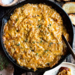You’ll start by caramelizing the onions and cooking them low and slow with lots of beer and fresh thyme. This is really the main step of the recipe. Once that’s complete, it’s a simple mix of cheddar cheese and a few other ingredients that gets loaded into a cast-iron skillet and baked until bubbling. So much flavor. So very delicious.