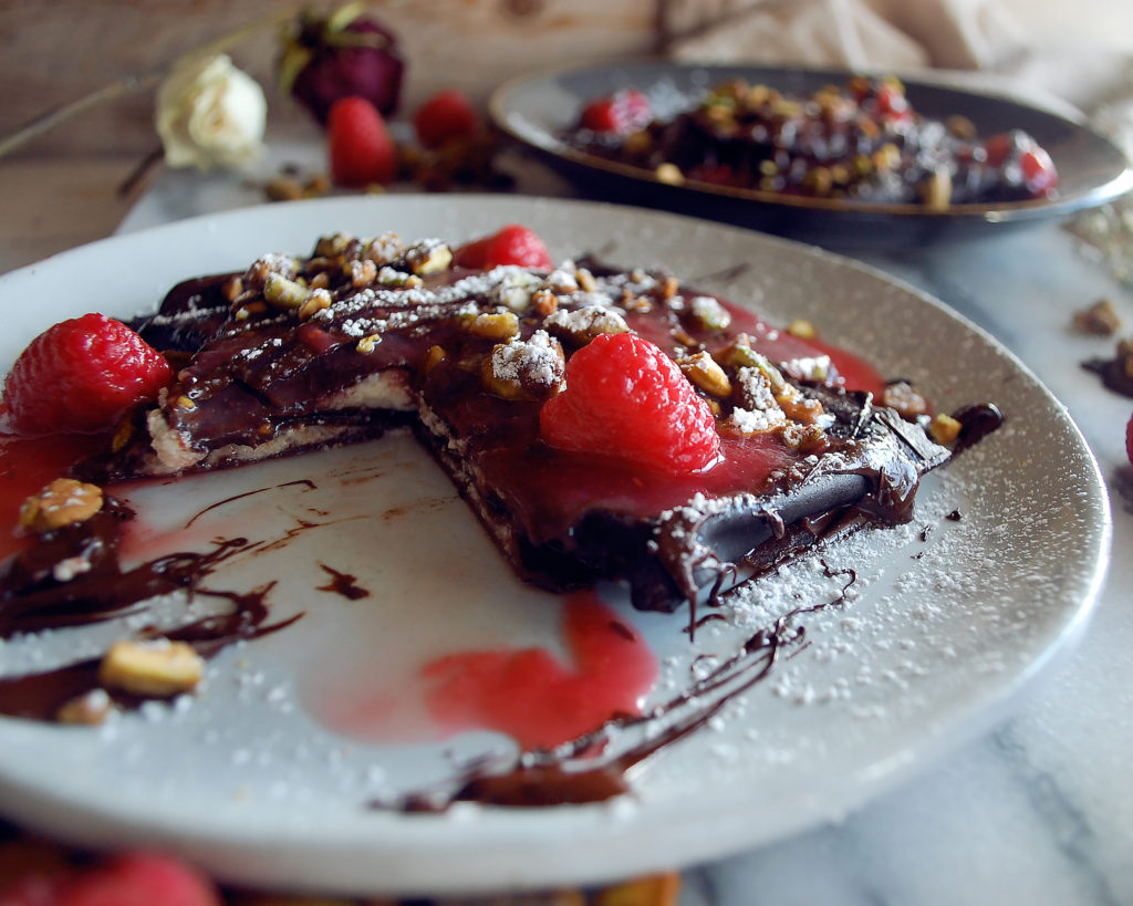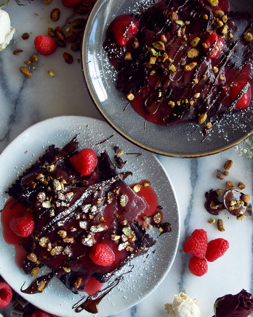 homemade dark chocolate ravioli filled with sweetened ricotta & topped with raspberry sauce, melted dark chocolate, and pistachios