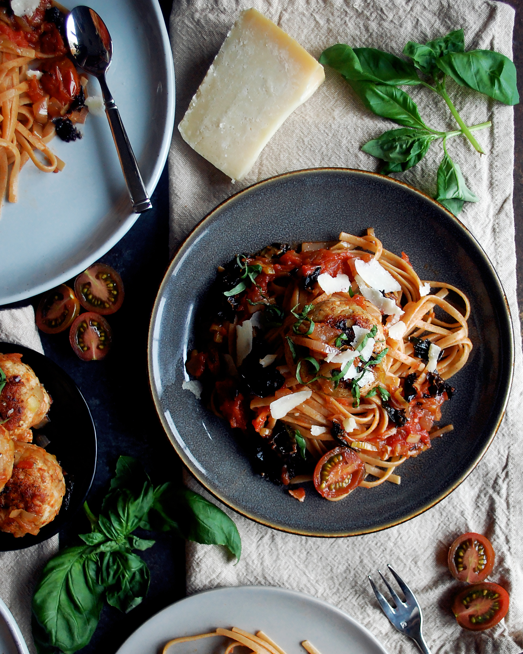 Turkey Meatballs with Chunky Tomato Basil Sauce & Whole Grain Linguine