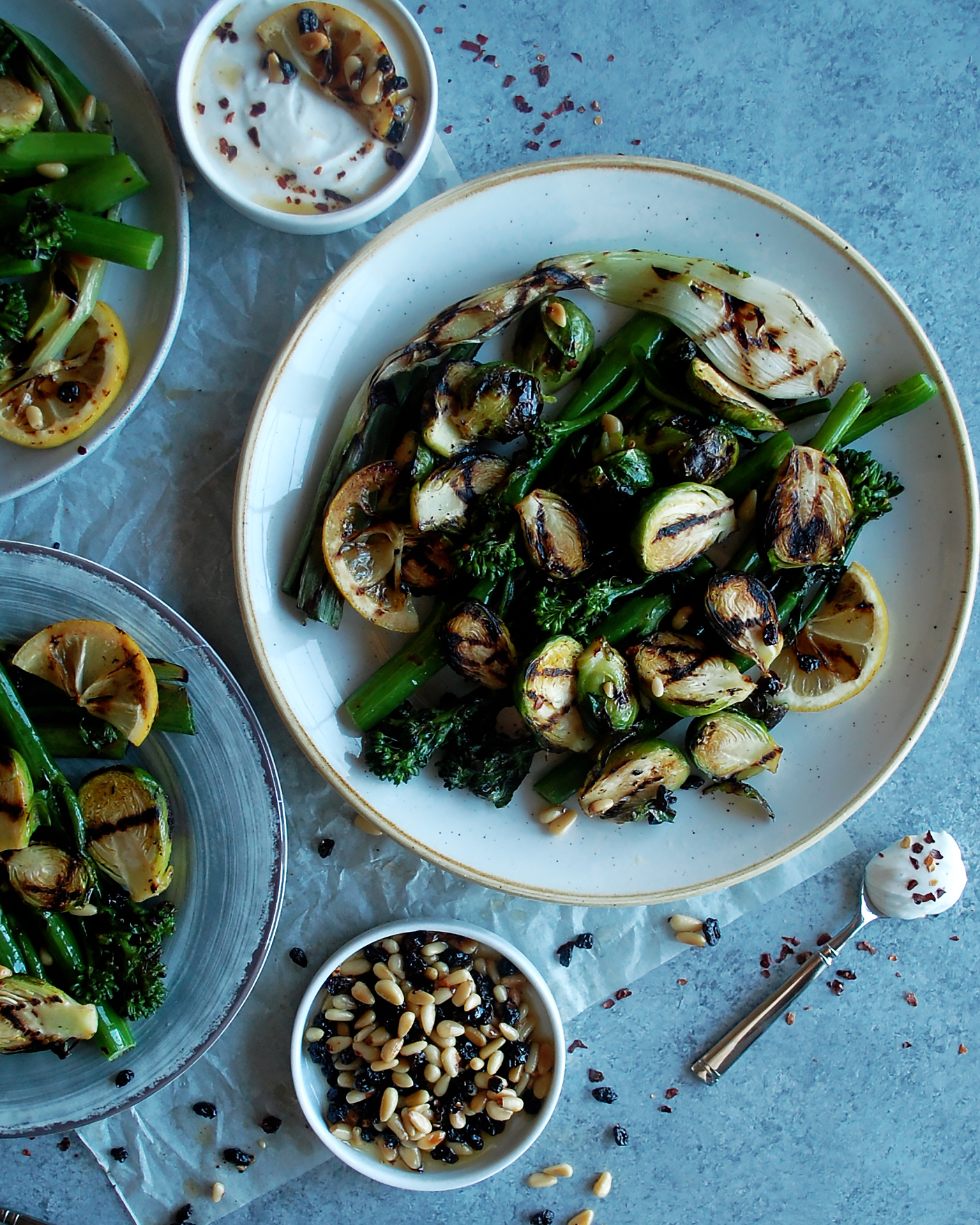 Grilled Broccolini & Brussels with Lemon Yogurt
