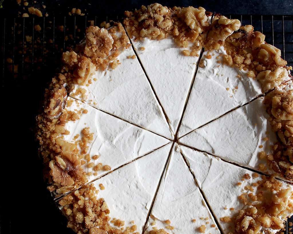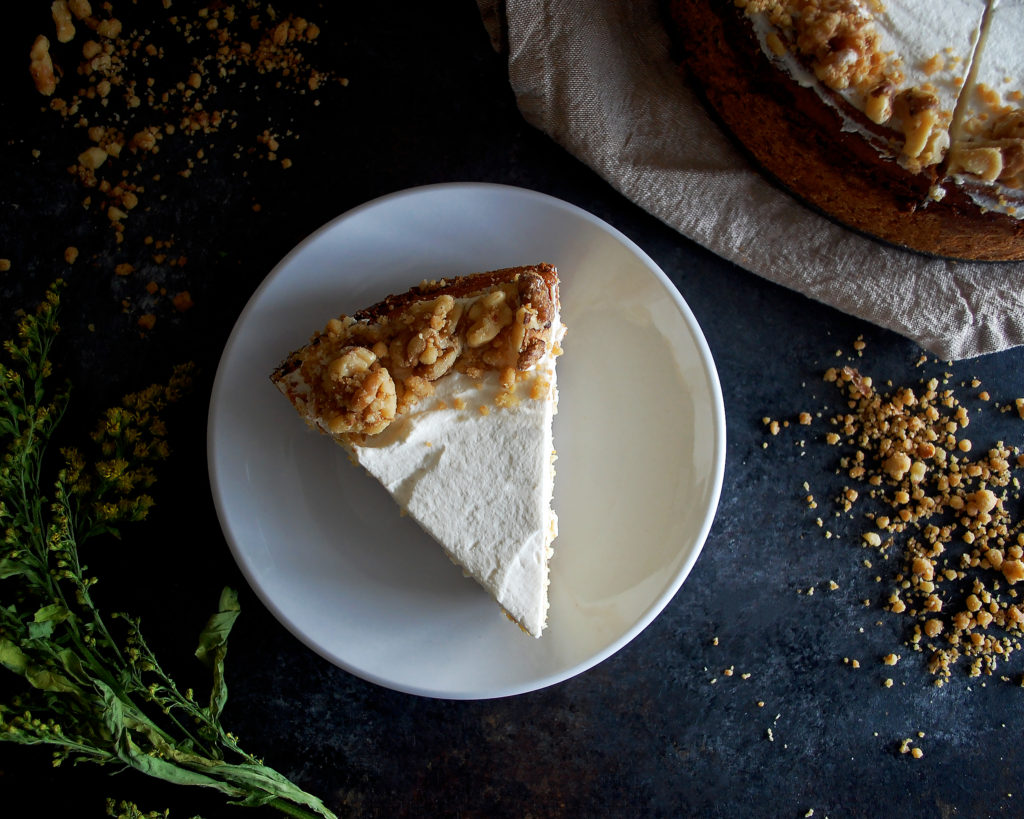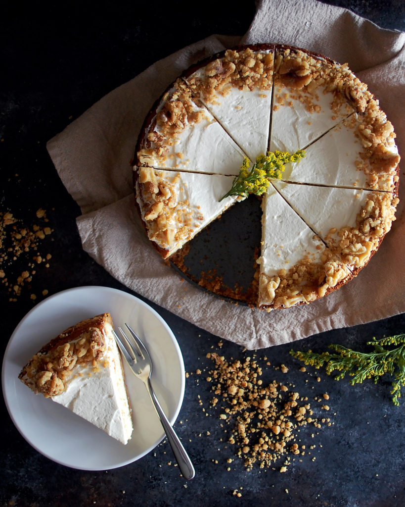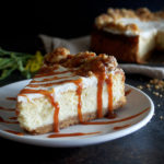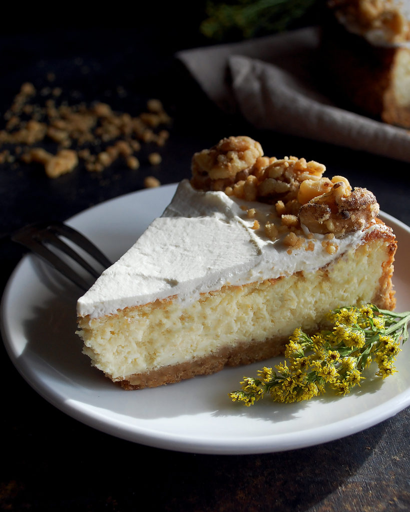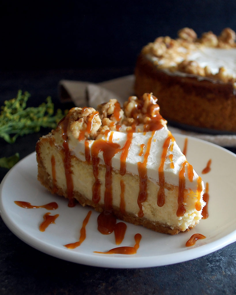 - Spread the whipped cream (recipe below) in an even layer on top of the cheesecake. Slice the cheesecake into slices. Sprinkle the cooked walnut streusel around the edges. Drizzle the caramel (recipe below) over the top. Serve chilled or at room temperature.