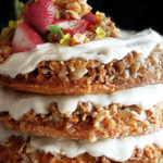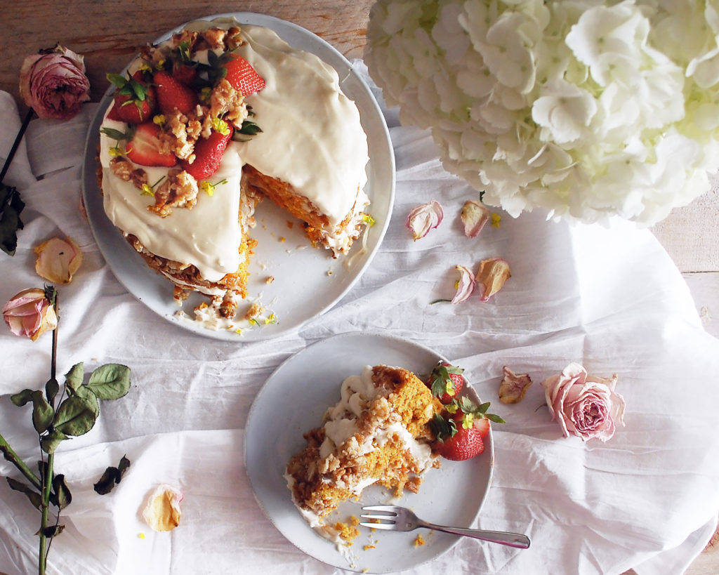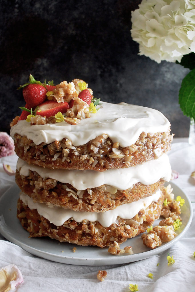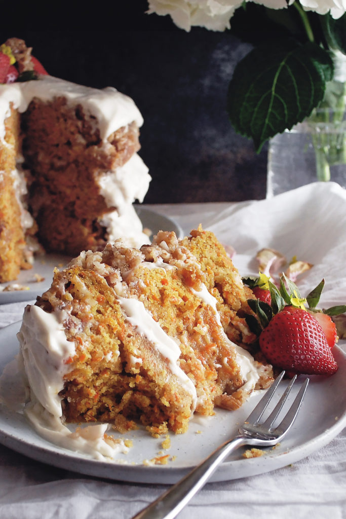 And that is it! The absolute best, most indulgent carrot cake. I top it off with some fresh strawberries and a little bit of the praline that got stuck on the pans as the cakes baked (turned out to be the perfect garnish).
