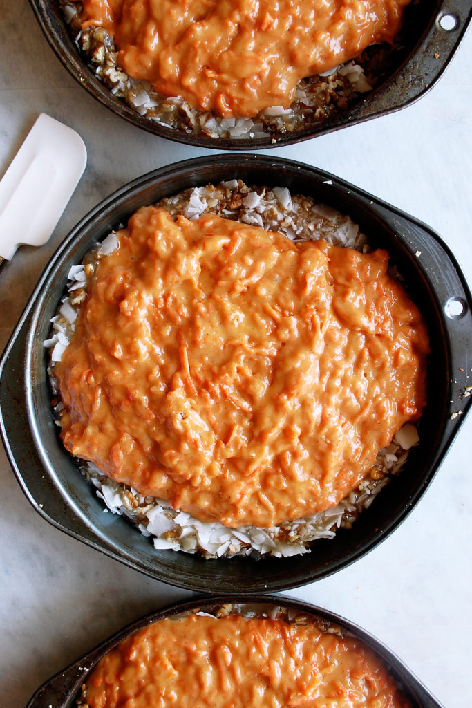 In a saucepan, you simply heat butter, whole milk, and sugar together until bubbling. This mixture goes straight into the bottom of the cake pans. I sprinkle toasted pecans and coconut chips over top. And the carrot cake batter gets poured right in. So…as the cakes bake, that praline layer caramelizes and the butter almost “fries” the cake in a sticky, sweet, crunchy mixture. When these things come out of the oven, they’re bubbling and smelling crazy good.