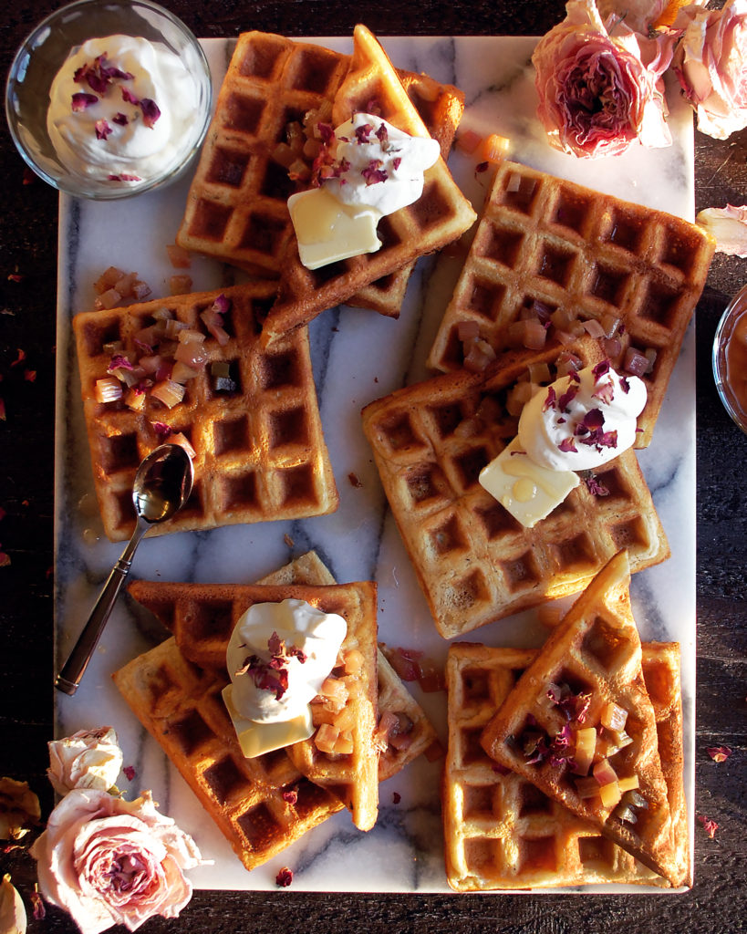 - Serve the buttermilk waffles with a spoonful of maple poached rhubarb, a slice of butter, and a dollop of the whipped cream. Drizzle the syrup over top. Garnish with dried rose petals, if you’d like.