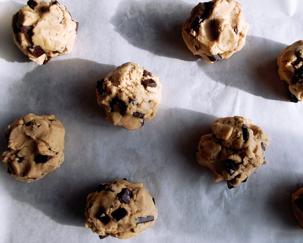 - Prepare a sheet pan with parchment paper. Divide the dough into 12 (4 oz) pieces. Shape each piece of dough into a ball and place on the sheet pan, leaving a good amount of space in between each one (you may need to use two sheet pans). Chill the dough balls for 30 minutes. You could also freeze the dough at this point to save for later. Bake the cookies for about 15-18 minutes until golden brown. You want the cookies to still be soft and chewy on the inside. Immediately sprinkle each cookie with a pinch of maldon salt when they come out of the oven. Let cool slightly. I like to eat these when they are still warm.