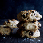 thick, gooey chocolate chunk cookies with tahini and sea salt