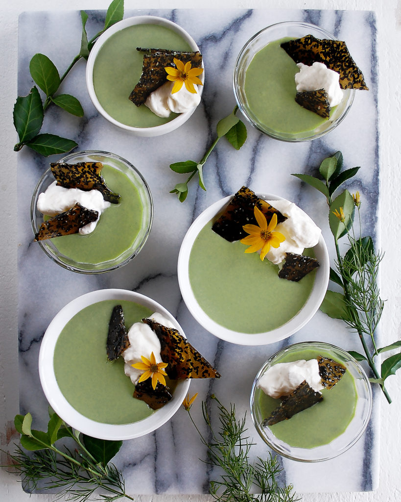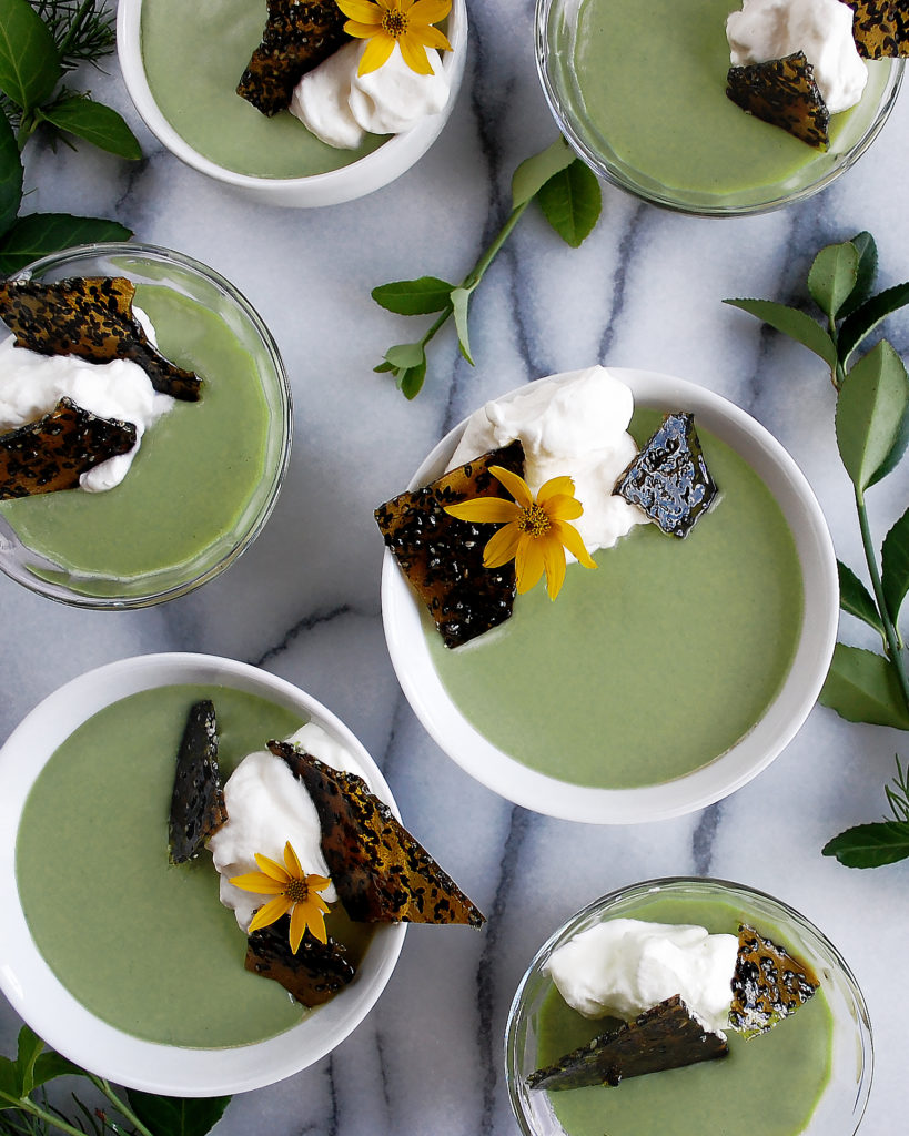 Once the custard cools slightly, I divide it into small dishes and refrigerate until set. When ready to serve, I garnish each dish with a small spoonful of whipped cream and a few pieces of black sesame brittle. The black sesame seeds work so well with the ginger and matcha flavors. Plus, the brittle turns out beautifully and adds a lot of character to the dish. Enjoy!