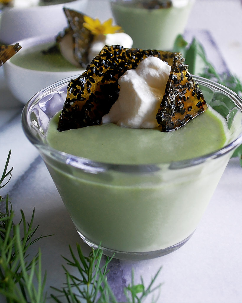 rich custard flavored with ginger, matcha, and white chocolate topped with whipped cream and black sesame brittle