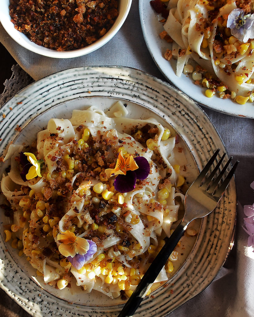 PrintSmoked Corn Tagliatelle with Bacon Breadcrumbs