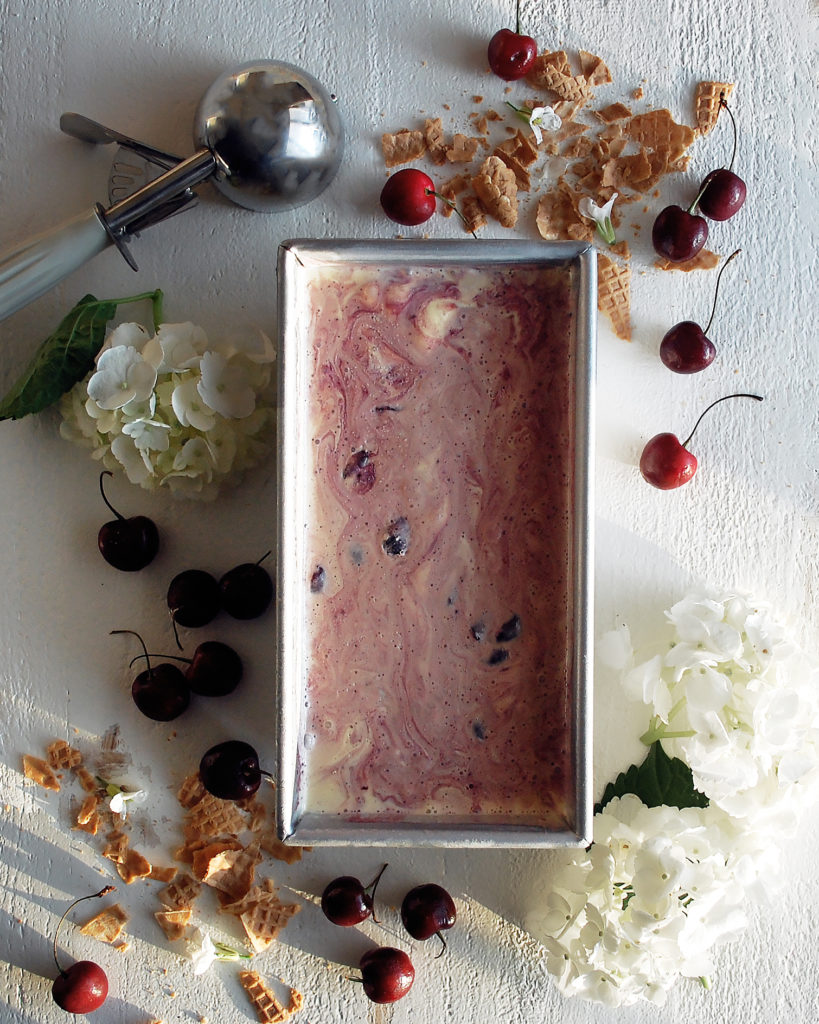 creamy vanilla ice cream swirled with cooked cherries and red wine syrup (yields 1 1/2 quarts)