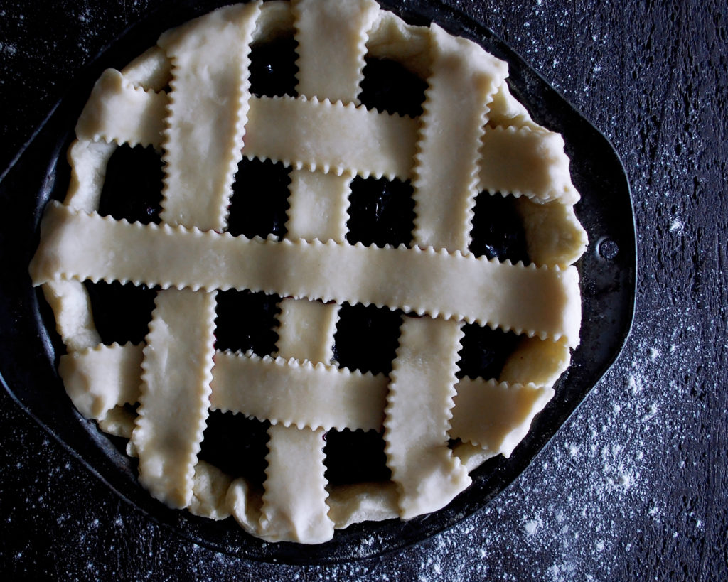 - Pour the blueberry filling into the par-baked pie crust. Take the remaining dough out of the refrigerator and let temper for 5 minutes. Transfer it to a floured surface. Roll the dough out to the same thickness as the first half. Cut the dough into 1” strips (I used a ravioli cutter to get the jagged edges). Create a lattice pattern on top of the pie using the strips of dough. Trim the edges of the strips and press them into the bottom crust. You can also tuck the strips into the filling so they stay put.