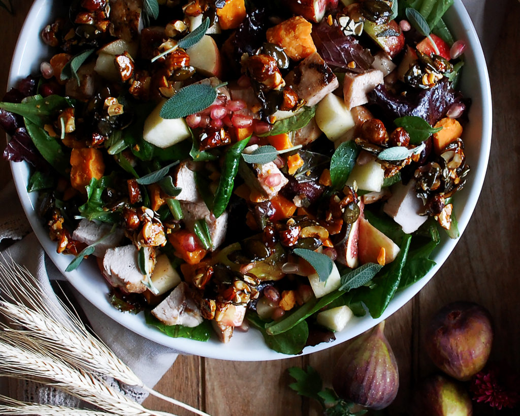 a hearty, satisfying autumn harvest salad with apples, cheddar, charred chicken, candied pumpkin seeds + hazelnuts, and a pomegranate sage vinaigrette