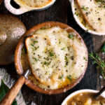 Classic French onion soup is a fall and winter staple. Mine is rich, full of deeply caramelized onions, full of warming herb flavor, and of course topped with lots of melted gruyere cheese over slices of toasted baguette.