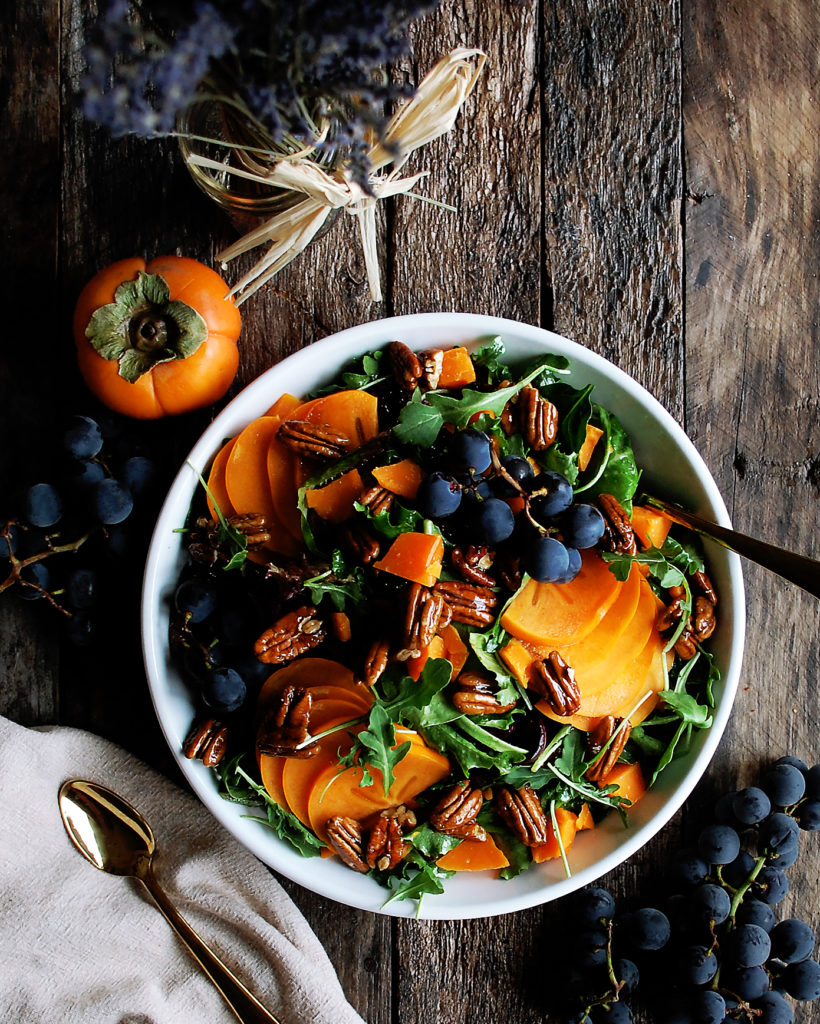 Apart from the greens and persimmons, I add sharp, salty mimolette cheese (aka my favorite fall cheese, simply because of its deep orange color), maple glazed pecans, and that is it!