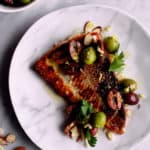 And there you have it! You’ll be on your way to crispy skin fish in no time. I served mine with a simple olive topping, some toasted sliced almonds, lots of lemon, and really good olive oil.