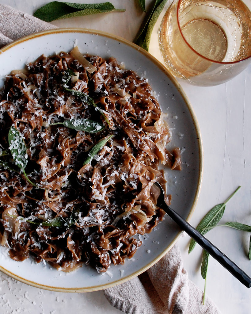 simple, rich homemade black garlic pasta with a caramelized shallot sauce
