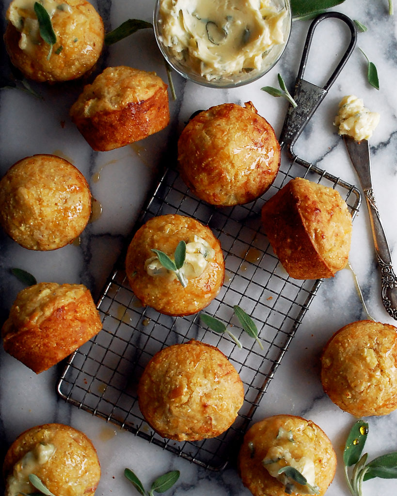 cheesy cornbread muffins with cheddar, caramelized apples, and maple sage butter