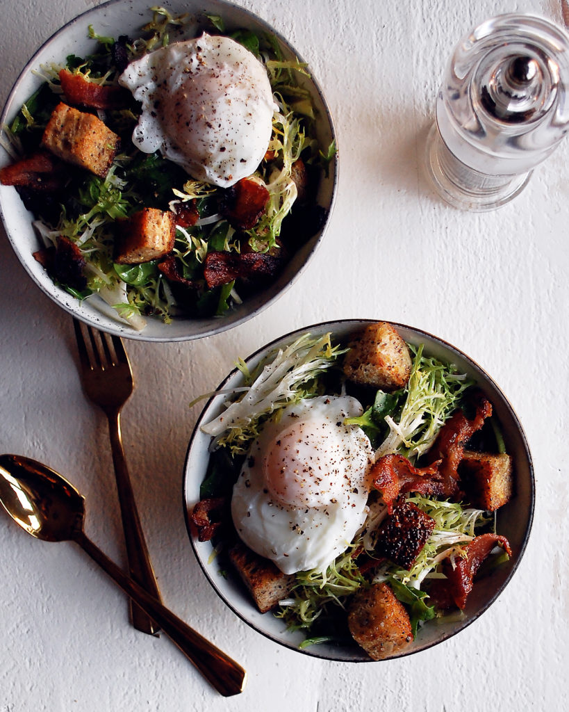 a simple, hearty frisee & arugula salad with mustard bacon vinaigrette, homemade croutons, and poached eggs