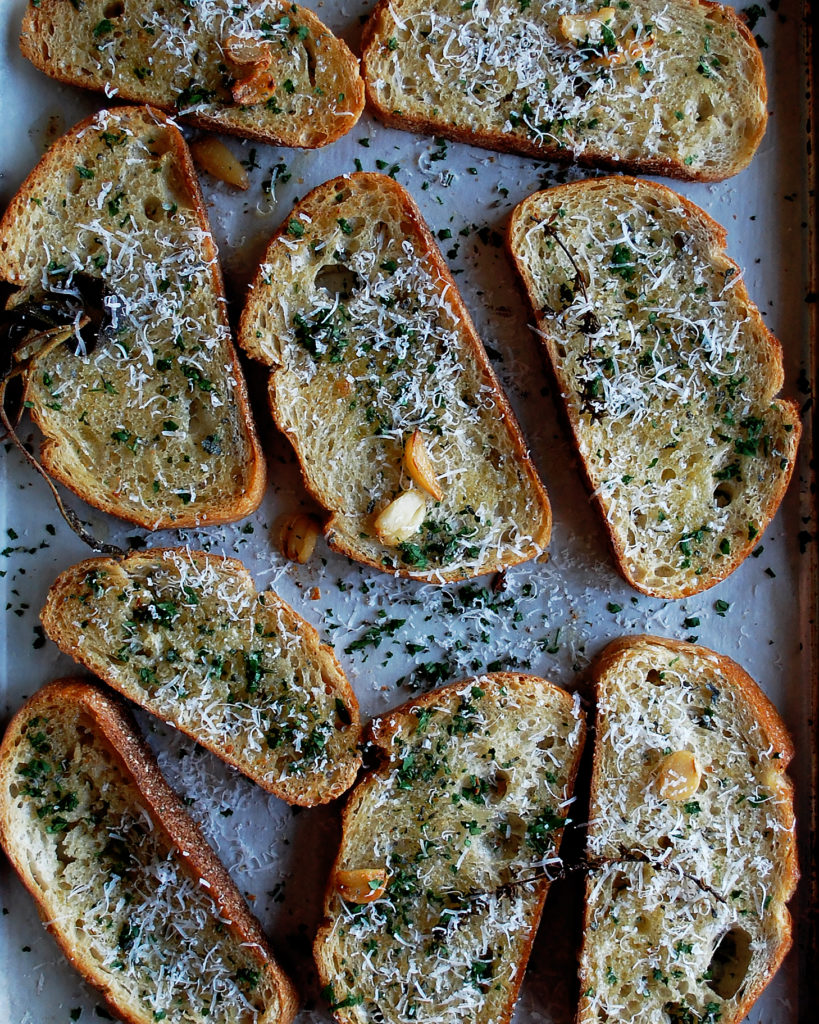 In a small saucepan, add the butter, garlic, sage, and thyme. Let the butter melt over medium heat and come to a bubble. Simmer for 15 minutes on low. Place the slices of bread on a sheet pan and brush a generous amount of the flavored butter over top each slice. Toast the bread in the oven at 400°F for 10 minutes until golden. Freshly grate lots of parmesan cheese over each toast.