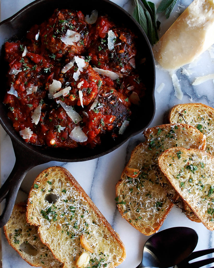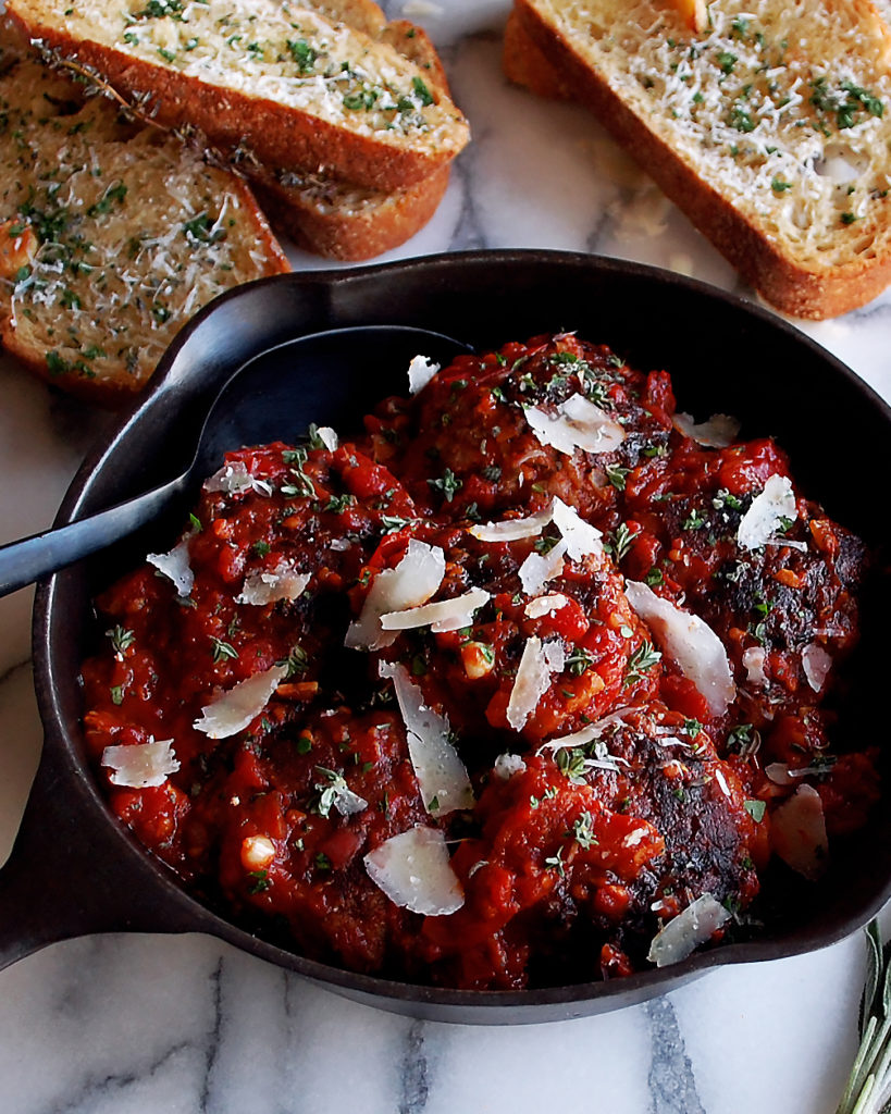 classic seared meatballs with a sweet, caramelized tomato sauce and buttery herb garlic bread