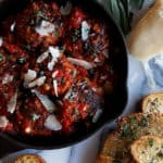 classic seared meatballs with a sweet, caramelized tomato sauce and buttery herb garlic bread