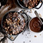 In a large mixing bowl, whisk the eggs. Add the brown sugar and Nutella, whisking until smooth. Gradually add the milk, whisking until incorporated. Stir in the vanilla and salt. Add the brioche bread cubes and half of the chopped hazelnuts to the egg mixture and mix well until the liquid has been absorbed by the bread (it will absorb very quickly). Grease an oven-safe baking dish with butter (I used 2, 6” wide bowls that are 3” high…a regular 9×13” baking dish will work, too). Add the bread mixture to the dish. Top with the remaining hazelnuts.