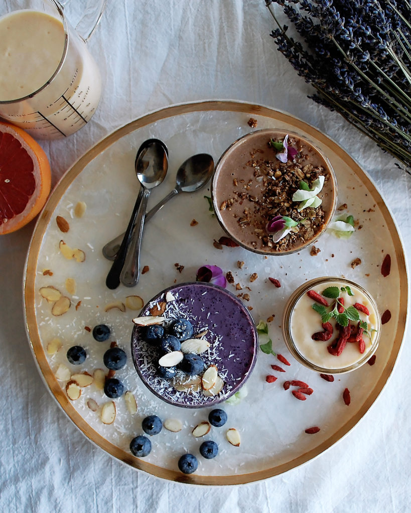 three breakfast smoothies: blueberry almond coconut, vanilla grapefruit mango, and chocolate peanut butter banana