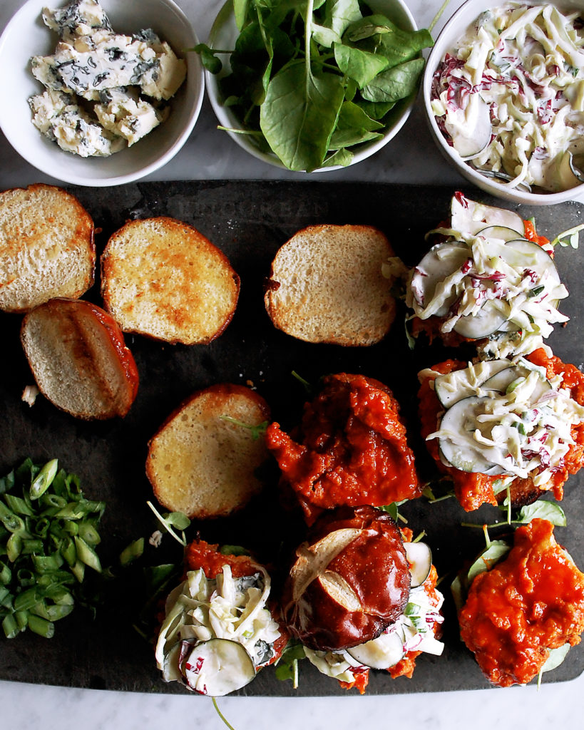Buffalo Blue Cheese Fried Chicken Sliders with Sweet Pickle Slaw