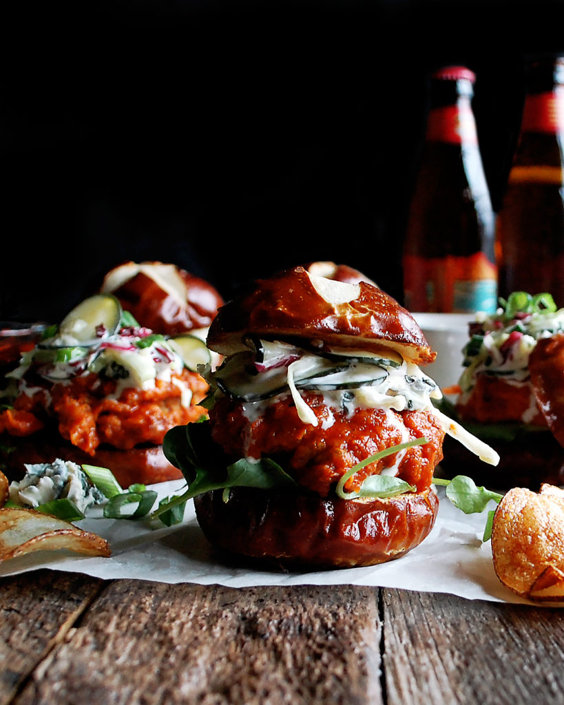 buffalo fried chicken sliders with blue cheese, sweet pickle slaw, and homemade potato chips