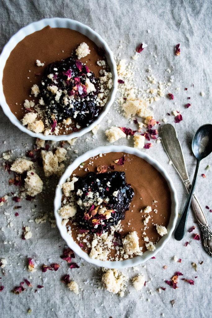 - To serve, top the chocolate mousse with the berry wine jam and crumbled shortbread. Garnish with crushed rose petals if desired.